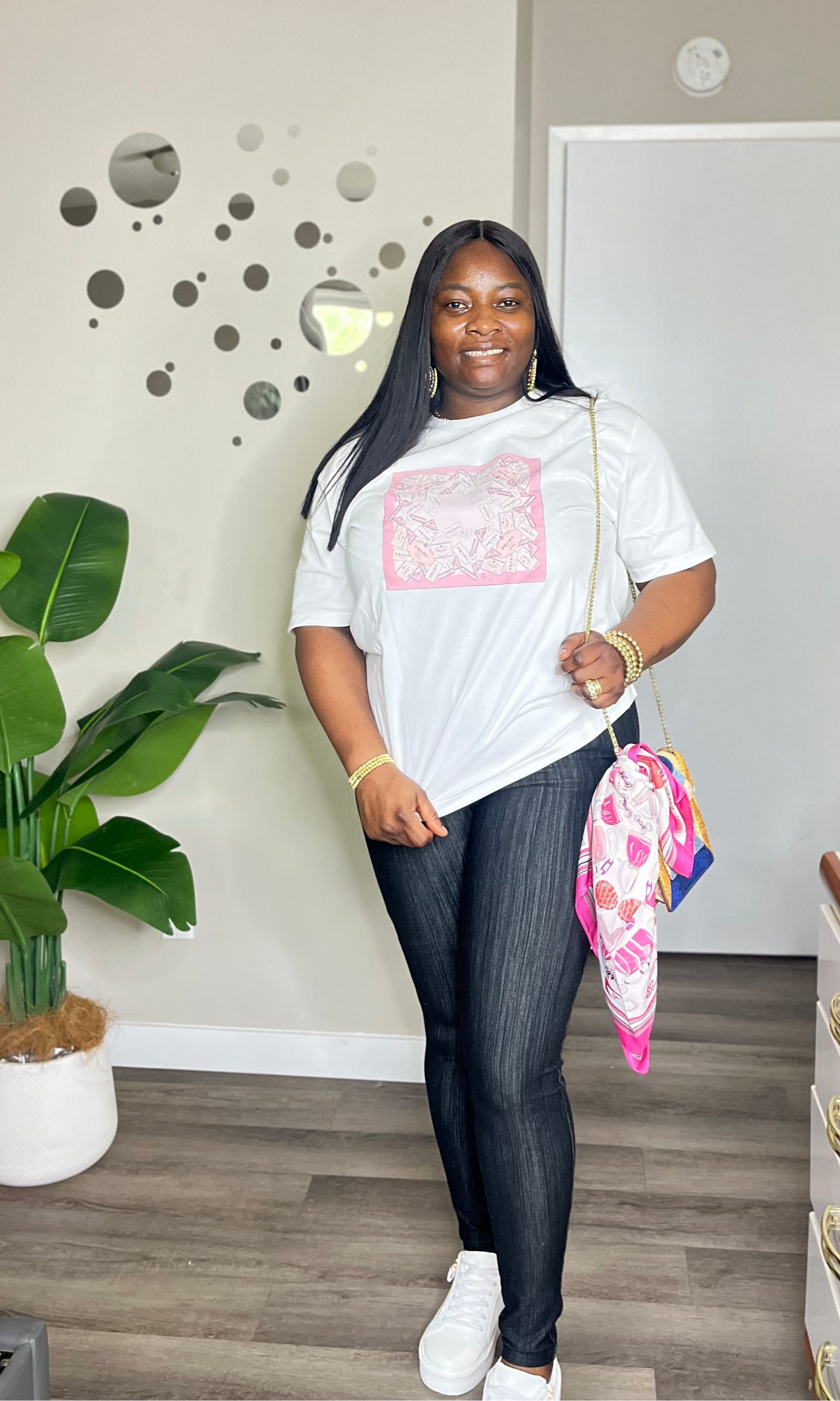Rock a unique look with our T-shirt featuring pink graphics and a vintage scarf! Add a touch of quirkiness to your outfit with this playful combination. Stand out from the crowd and show off your fun personality with this one-of-a-kind piece. (vintage scarf included!)